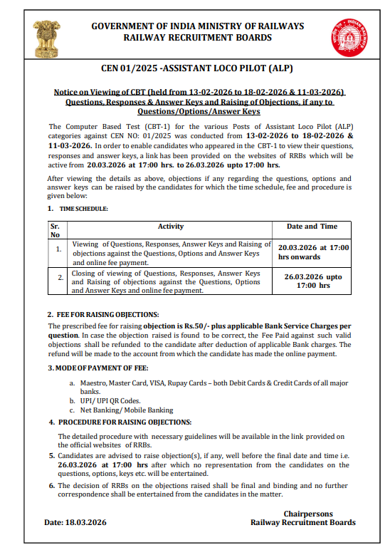RRB Technician Answer Key 2026: The Railway Recruitment Board (RRB has conducted the computer based test (CBT) for Technician Grade III from 06 to 10 March 2026 across various exam centers. Candidates who have appeared in the examination are waiting for answer key to be released. As per official notice, the RRB Technician Answer Key will be downloaded from 19 March 2026 onwards on the official website. To access the answer key, candidates shall visit the official portal at www.rrbapply.gov.in by using their username and password to get the details. Additionally, candidates can download response sheet PDF to compare their marked answers against answer key & estimate their score before official results are announced. The candidates will have option to raise objection against any error through RRB website by paying a prescribed processing fee. For more details, always refer to official sources.